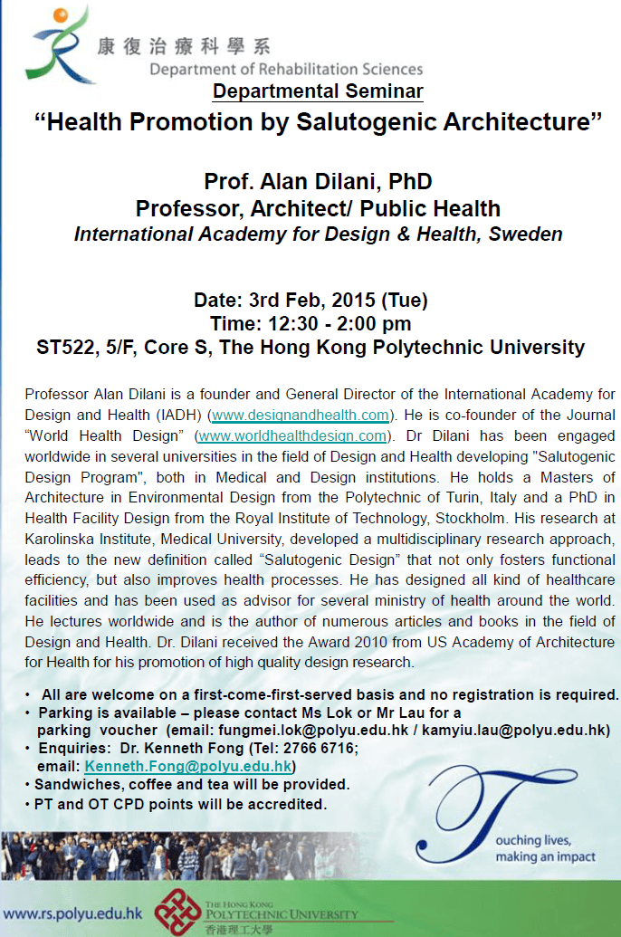 5.2.2015 Joint organizer with Hong Kong Polytechnic University, Department of Rehabilitation Sciences on seminar “Health Promotion by Salutogenic Architecture” by Professor Alan Dilani of International Academy for Design & Health. |